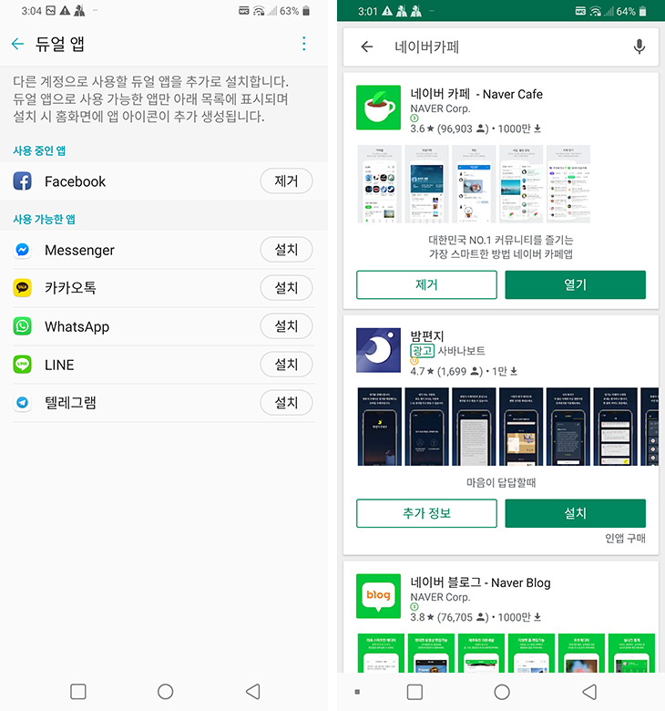 한가지 좀 아쉬웠다면 네이버카페 처럼 아이디로 로그인 해야 하는 이 앱은 듀얼 앱에서 인식이 안되네요. 네이버카페도 아이디를 다르게 해서 로그인이 가능한데 이것이 안되는게 좀 아쉬웠습니다. 추후에 업데이트로 이것도 가능하면 좋겠네요.