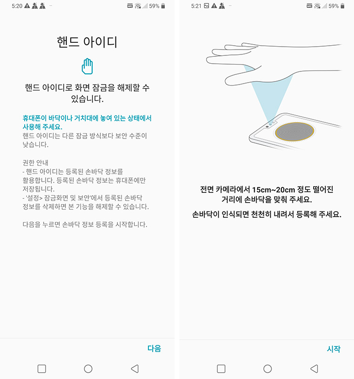 손바닥을 움직여서 손바닥의 정맥을 인식 시킵니다. 시키는대로 하면 한번 등록이 되는데요. 1개만 등록이 가능합니다. 손바닥 정맥을 이용한 잠금해제는 지문인식보다는 안정성이 떨어집니다. 이것은 도움말에도 나오더군요. 다만 잠금해제를 할 때 얼굴인식과 지문인식 핸디 아이디까지 등록을 해두면 잠금 해제가 무척 편리해집니다.