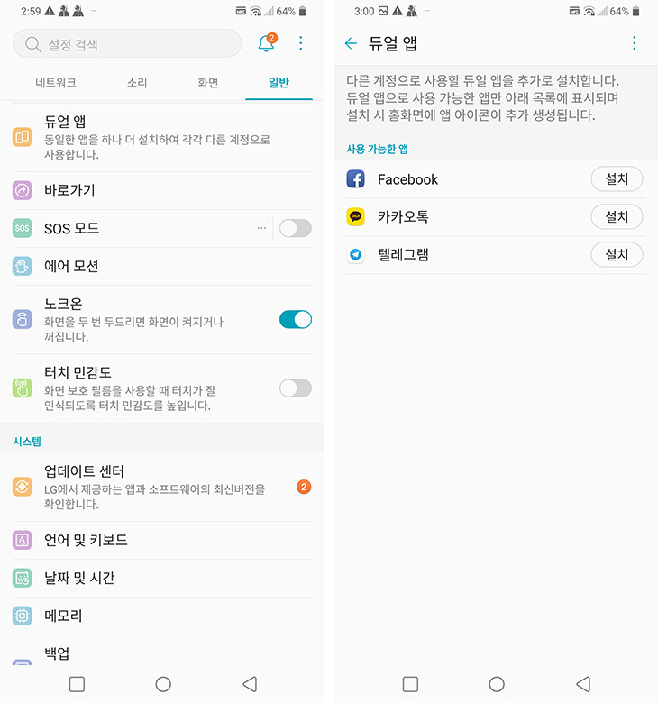 듀얼 앱을 이용할 수 있습니다. 이것은 스마트폰을 회사에서도 개인적으로도 사용시 필요한 기능인데요. 메신저를 사용시 자신의 아이디로 메신저를 이용한다고 하면, 회사일을 마치고 집에 있어도 메신저를 보면 계속 일을 하는 느낌이 들 수 도 있습니다. 그런 이유로 회사에서 어쩔 수 없이 메신저를 사용해야 하는 경우 회사이메일로 계정을 새로 만들거나 해서 자신의 계정과는 독립시키는 경우가 많은데요. 그럴 때 필요한게 메신저가 그냥 2개 로그인이 될 수 없을까 하는 부분이죠. 페이스북을 회사용, 개인용 이렇게 2개를 동시에 로그인을 하는 것 말이죠.