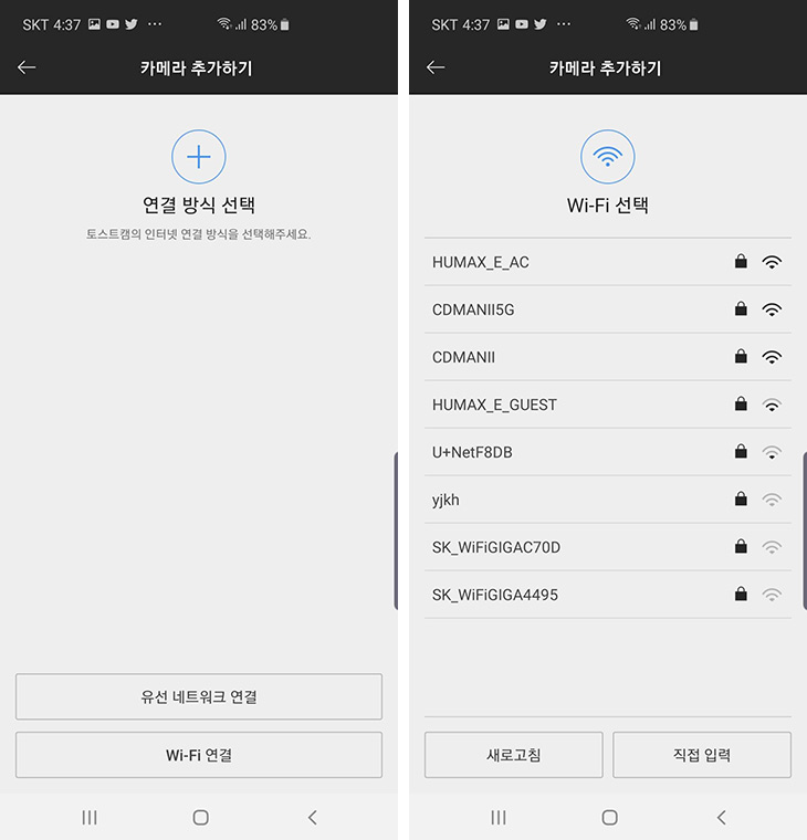 연결 방식을 선택 합니다. 저는 WiFi 연결을 선택 했습니다. WiFi 선택에서 연결할 수 있는 유무선공유기의 SSID를 선택 합니다. 토스트캠은 2.4/5GHz의 대역 모두 다 지원을 합니다.