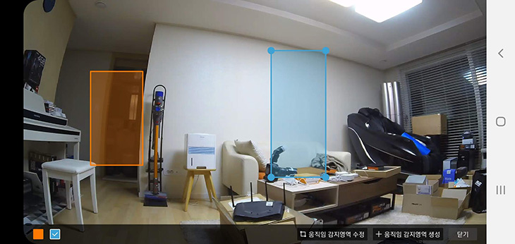 움직임을 감지하는 영역은 쉽게 추가할 수 있는데요. 화각이 넓으므로 특정 부분에 박스를 만들고 이부분에 움직임이 있을 때 알림을 받을 수 있습니다. 금고 앞부분에 아무도 안가는데 갑자기 움직임이 감지되었다면 수상한 행동이겠죠. 그럴 때 알람을 바로 받을 수 있습니다. 귀가시 카메라 꺼짐 설정등을 할 수 도 있는데 토스트캠은 블루투스가 가능해서 스마트폰이 집에 있을 때는 주인이 집에 있다고 생각하여 자동으로 녹화를 안하도록 할 수 도 있습니다.집 밖에 나갈때만 녹화하도록 할 수 있죠.
