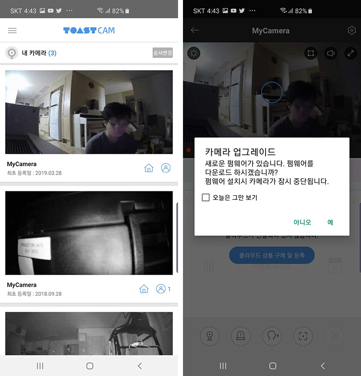 카메라 등록이 완료가 되었습니다. 토스트캠 화면이 3개가 되었네요. 처음에는 펌웨어 업데이트를 한번 해야 했습니다. 실제 사용시 가끔 펌웨어 업데이트를 자동으로 하게 됩니다. 사용자가 별로 신경 쓰지 않아도 알아서 펌웨어 업데이트도 진행하니 편리하긴 했습니다.
