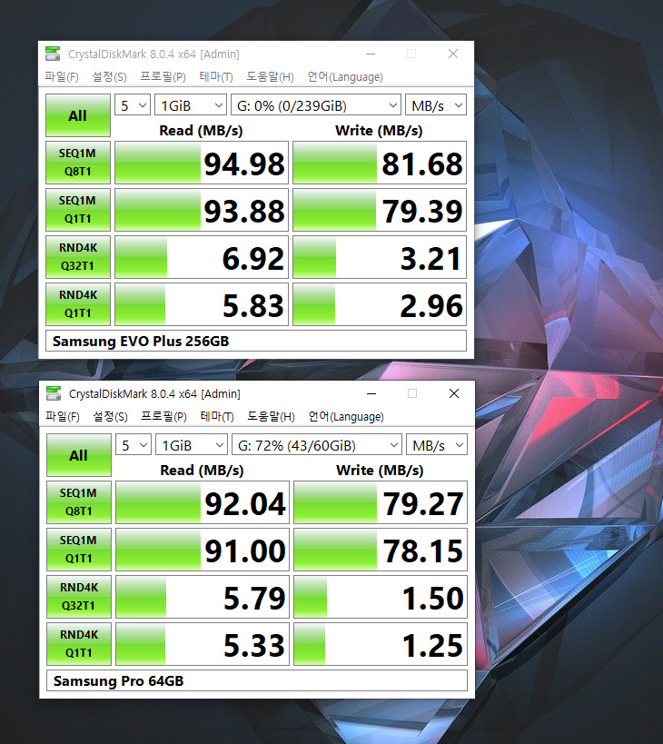 그런데 새로 구매한 메모리나 이전에 쓰던 삼성 PRO SD나 성능이 거의 비슷하네요. 130MB/s 이상 전송속도 지원한다고 해서 읽기 성능이 그정도는 나올줄 알았는데 막상해보니 그정도까지는 아니네요. 용량이 64 > 256GB로 늘어난것에 위안을 삼아야겠네요. 여기서 확실히 잘 봐야하는게 CLASS10 제품이면 성능이 엄청 낮을듯 한데 막상 그렇지도 않더라는것이죠. 물론 저가형 제품은 성능이 낮겠으나 성능이 높은데도 이전에 나와서 등급이 낮게 메겨진 제품도 있습니다. 엄청 이후에 나온 메모리나 성능이 이렇게 같은 것을 보면요.