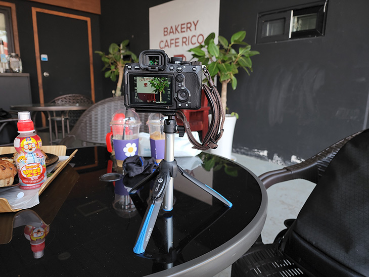 실제 사용하다보면 세로촬영이 필요할 때도 있는데요. 볼헤드를 이용해서 각도 조절이 가능하긴 합니다. 다만 무게 중심이 한쪽으로 쏠리니까 약간 불안정한 모습이 있긴 했습니다. 길이를 늘린 상태에서는 세로촬영이 사실상 힘들었습니다. 한쪽으로 바로 넘어집니다.
