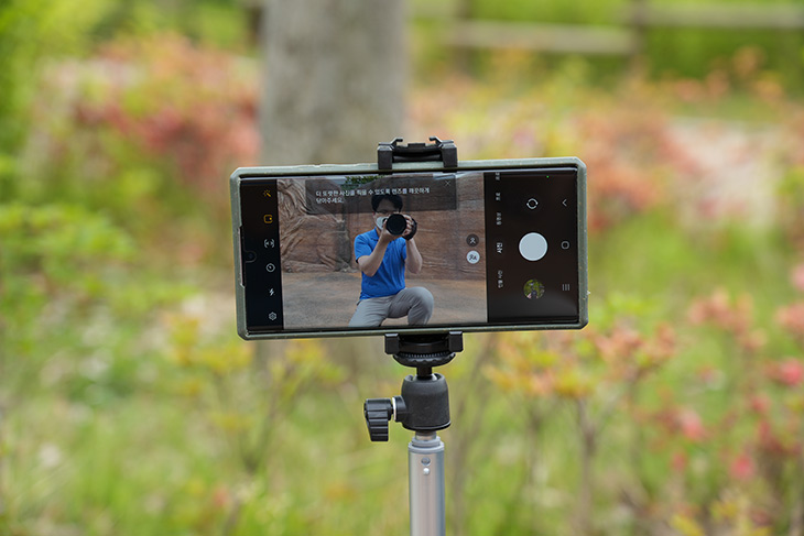 실제로 야외에서 사용을 해 봤는데요. 스마트폰을 거치해서 사용이 일단 가능합니다.