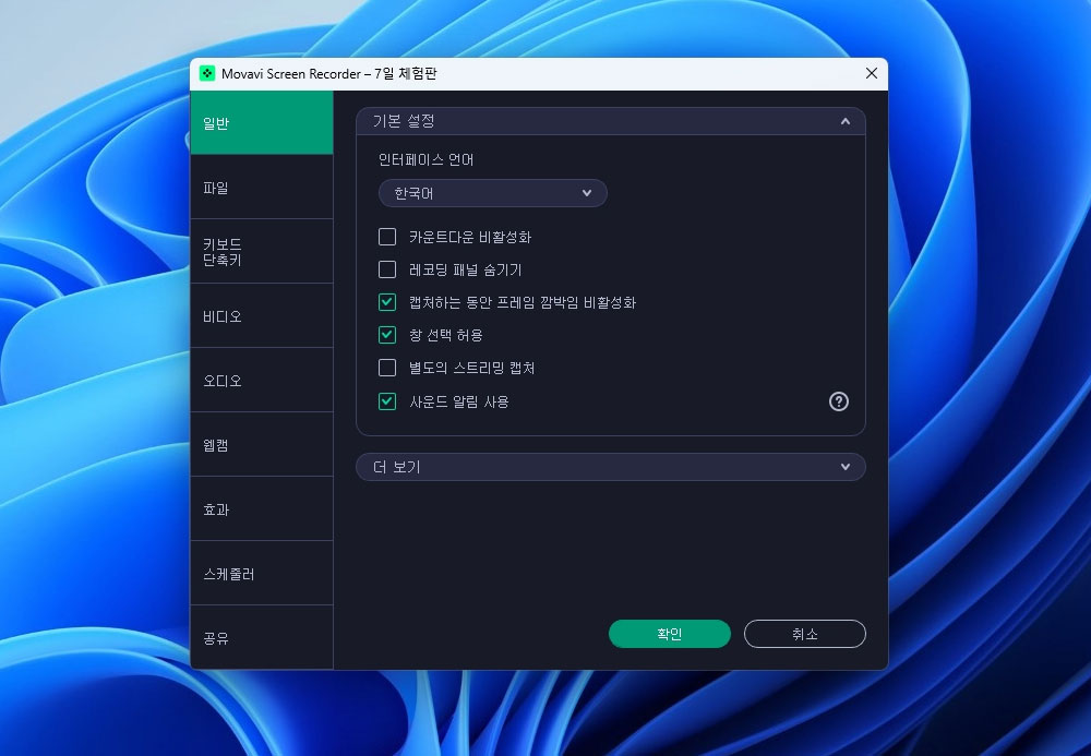 녹화 화면은 간단한 인터페이스로 되어있고 설정은 다양한 옵션을 제공했습니다.