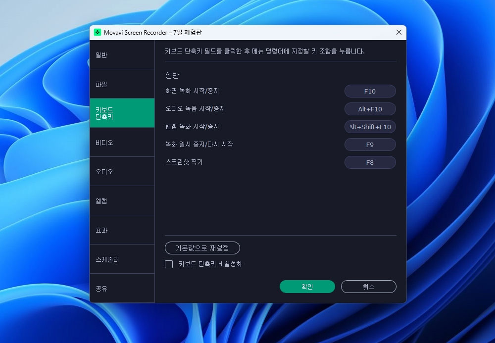 설정을 통해서 녹화 품질이나 단축키 등을 확인 가능합니다. 좀 아쉽다면 한국어를 지원하지 않습니다.