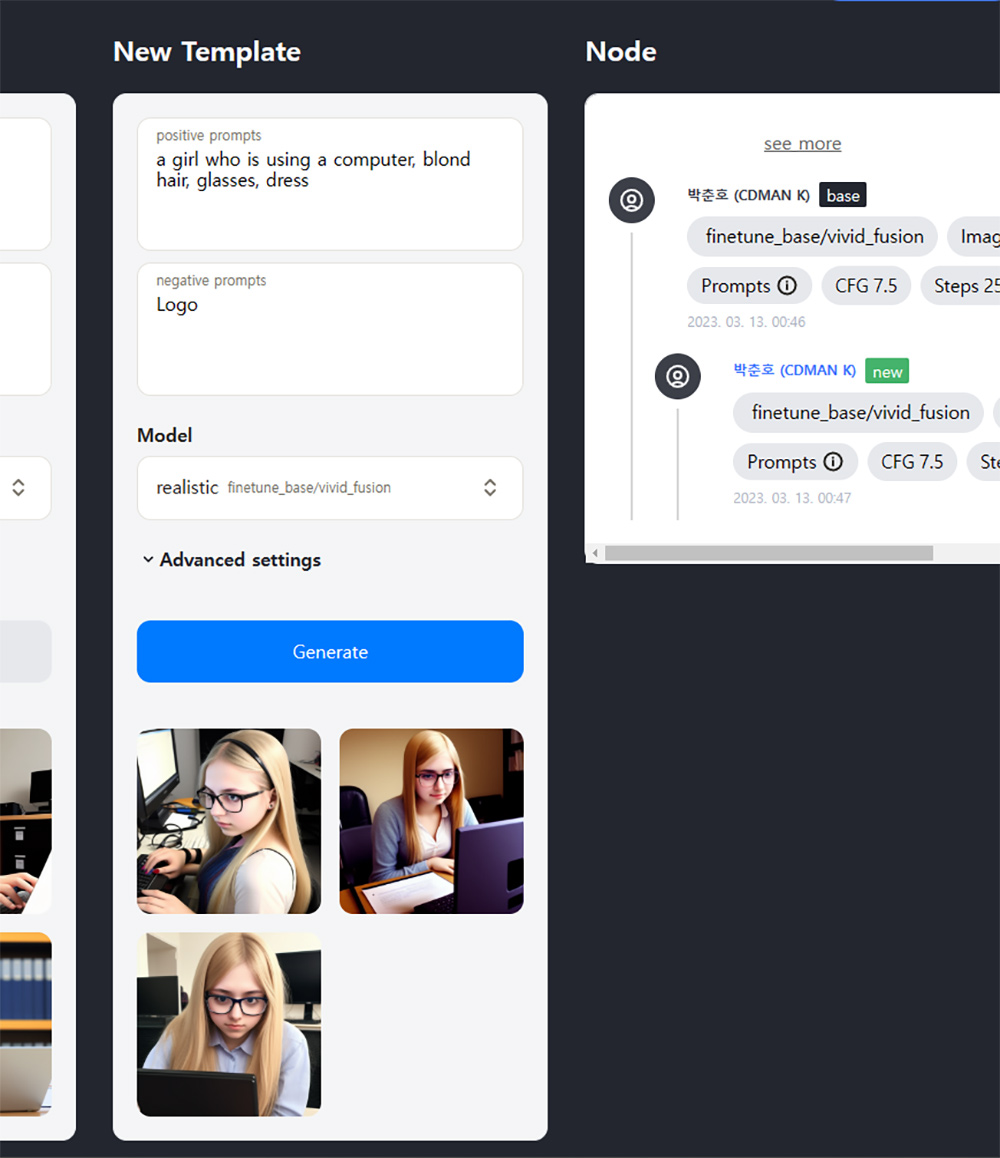 고급 옵션을 통해서 더 다양한 이미지를 만들 수 있스니다. Steps를 조정해서 더 여러단계를 거친 완성도 높은 이미지를 만들 수 있고 좀 더 자유도를 많이 줘서 결과물을 다양화 할 수 도 있습니다. 제가 입력한 내용은 오른쪽에 Note 부분에 명령어로 표현이 되기도 합니다.