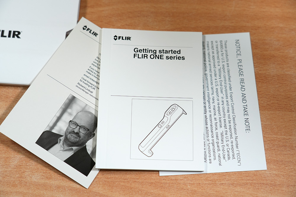 FLIR ONE Edge Pro 구성품으로는 제품 본체와 설명서, USB 케이블이 있습니다.