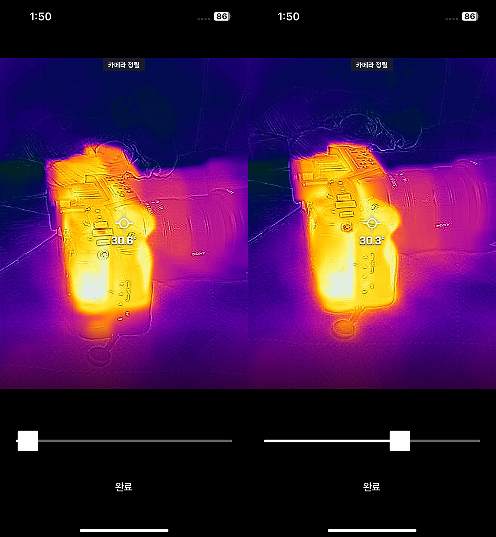 아래 메뉴에서 다양한 설정이 가능합니다. 열측정 범위를 자동 또는 수동으로 변경 할 수 있고, 컬러 팔레트를 조정할 수 있습니다. 컬러팔레트는 이미지로 잘 구분되어있어서 선택하기 편했습니다. 팔레트를 바꾼다고 열을 측정하는 부분이 바뀌거나 하는것은 아니지만, 눈으로 보기에 쉽게 파악할 수 있도록 도움을 줍니다.