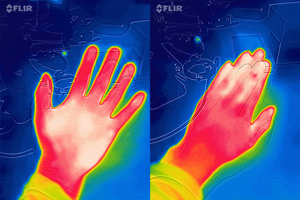 손도 촬영을 해 봤는데요. 온도가 높은 범위와 낮은 부분이 보입니다. 물론 적외선 사진에서 약간 물결 무늬 같은게 보이긴 하는데, 이정도 해상도인데 이정도 나오면 괜찮은 수준 같습니다.