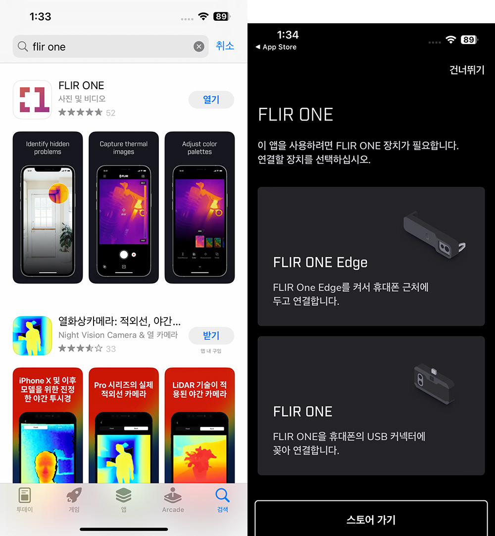 아이폰이나 안드로이드 스마트폰에서 "FLIR ONE" 앱을 검색해서 설치를 합니다.