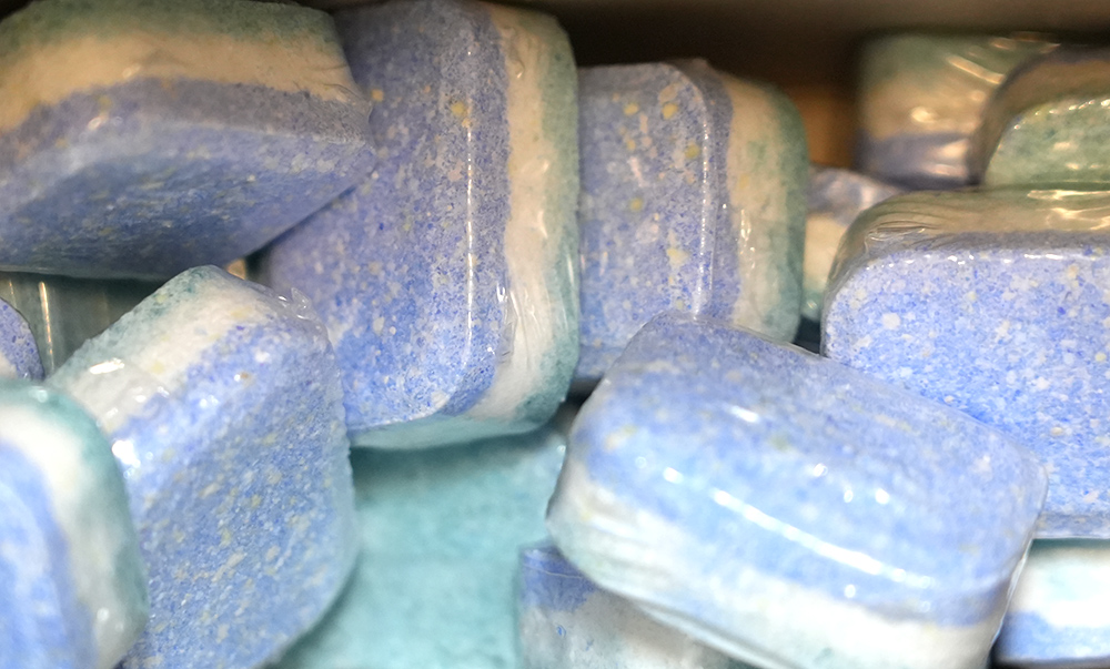 안을 열어보면 이렇게 타블렛 형태의 세제가 들어 있습니다. 세제는 수용성 비닐에 덮혀 있는데 한번 사용시 그냥 하나 넣으면 됩니다. 양이 많다고 생각하시는 분은 커터기로 반을 잘라서 쓰기도 하는데, 세제 가루 날리고 뭐 그런 이유로 그냥 하나 통째로 넣어도 됩니다.