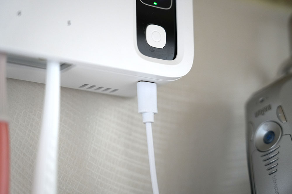 전원은 USB-C 방식으로 공급됩니다. 내부 배터리가 있어서 들고 다니면서 사용이 가능한데요. 집에서만 사용할 것이기 때문에 USB-C 충전기 하나 연결을 해 줬습니다. 이렇게 하면 항상 동작하면서 소독도 합니다.