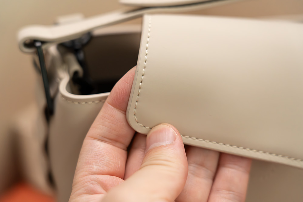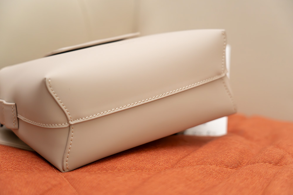 하단 부분에 박음질 상태 인데요. 사각 모양으로 모양이 잡혀 있어서 가방을 바닥에 놓아도 넘어지지 않고 잘 고정됩니다. 재질은 다르긴 하나, 가죽재질의 가방 같은 느낌을 충분히 느낄 수 있습니다.