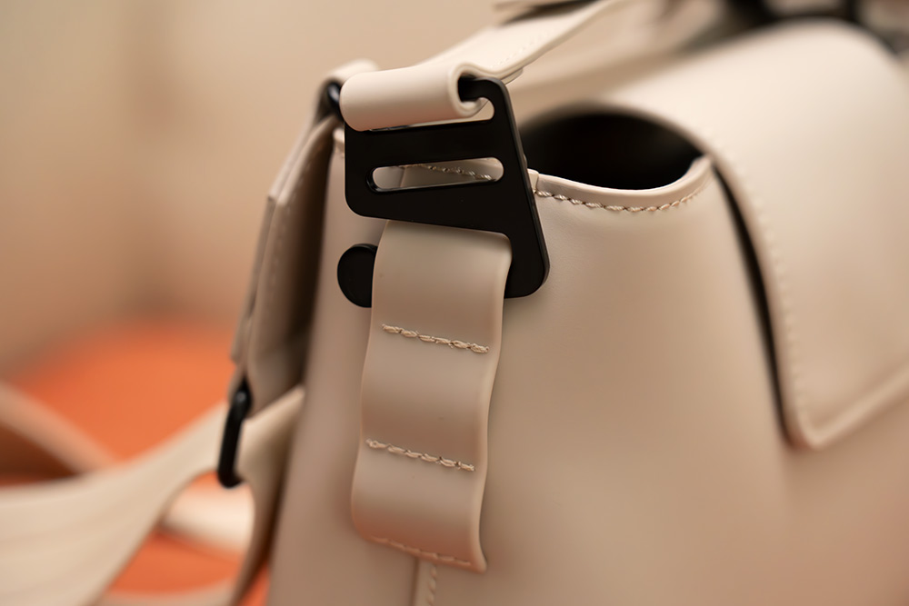 가방은 안에 뭔가 넣지 않아도 모양이 어느정도 유지 되는 형태였구요. 상단과 커버 부분에는 박음질이 되어있고, 아래쪽에는 박음질이 안보이는 형태 인데요. 전면 부분에 음각으로 가스톤루가 로고가 있습니다.