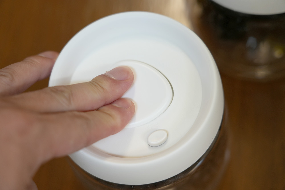 덮개를 닫고 큰 버튼을 여러번 누르면 유리병의 내부 공기가 외부로 빠지게 됩니다. 몇번 누르다 보면 버튼이 좀 들어간 상태가 되는데 그 상태가 진공상태가 되는 것 입니다.