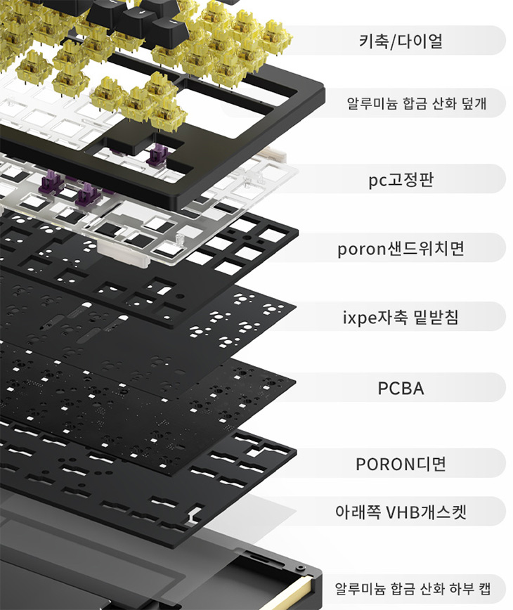 요즘은 대부분 개스켓 구조를 하고 있는데요. 키보드의 키를 누를 때 통울림을 잡아주고 부드러운 타이핑감을 유지할 수 있게 해줍니다. 기본적으로 알루미늄 케이스를 하고 있어서 키보드가 무거워서 통울림이 거의 없는데 이렇게 구조가 복잡하게 되어있어서 소리가 거의 안납니다.