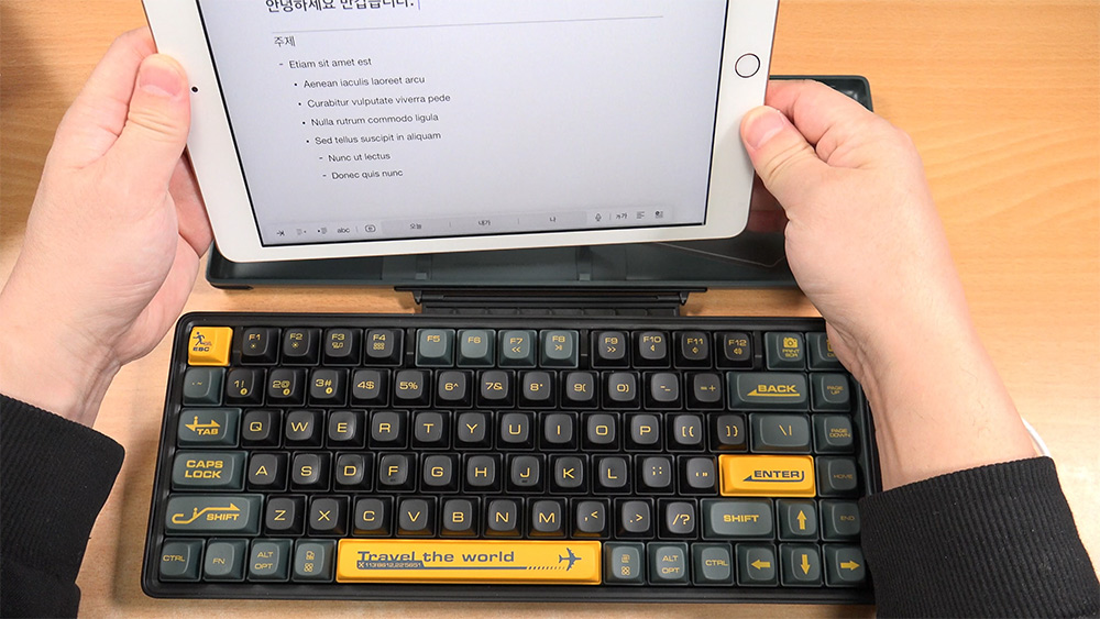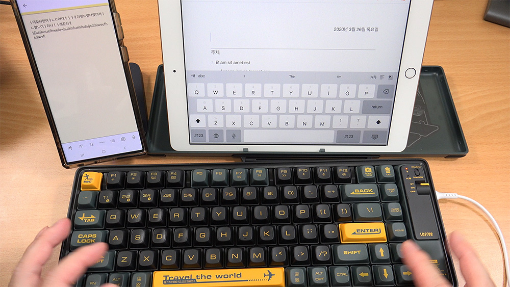 멀티페어링을 하면서 안드로이드 스마트폰과 아이패드를 번갈아가며 사용할 수 있었는데요. 근데 굳이 iOS/Android 모드를 변경해가면서 쓰지 않아도 사용하는데에는 문제가 없었는데요. 다만, 한영키에 해당하는 오른쪽 Alt 키를 입력 시 생각보다 오른쪽에 위치해서 실제 사용시에는 Ctrl + 스페이스바를 입력하는게 좀 더 편했습니다.