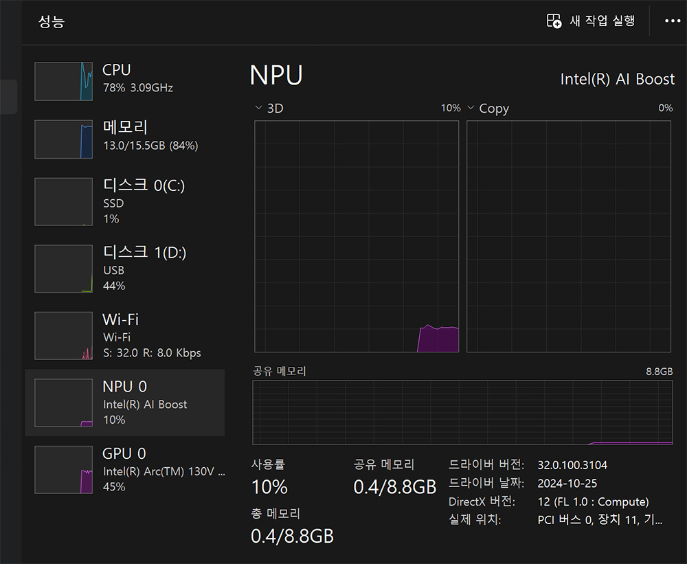 인텔® 코어™ Ultra 프로세서(시리즈 2)의 새로운 신경망 처리 장치 NPU는 이전보다 4배 더 빨라졌는데요. 생성형 AI나 AI를 활용하는 소프트웨어에서 이 부분을 활용해서 더 빠른 성능을 낼 수 있습니다. Copilot+ PC 에서 이부분을 더 적극적으로 활용하게 될텐데요. 아직은 적용해서 보여줄만한 부분이 준비중이라 나오면 그부분도 다뤄보겠습니다.