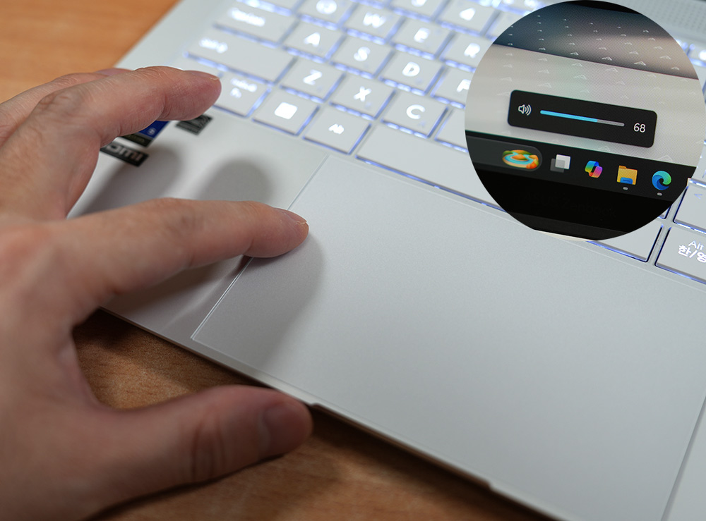볼륨 조정 경우 F2, F3키를 이용해서 조정할 수 있긴 하지만, 터치패드의 왼쪽 끝부분을 위아래로 슬라이드를 하면 간단하게 볼륨 조정이 가능합니다. 갑자기 소리가 크게 나오면 당황할 때가 있는데 간단하게 조정 가능해서 꽤 자주 쓰게 되더군요.