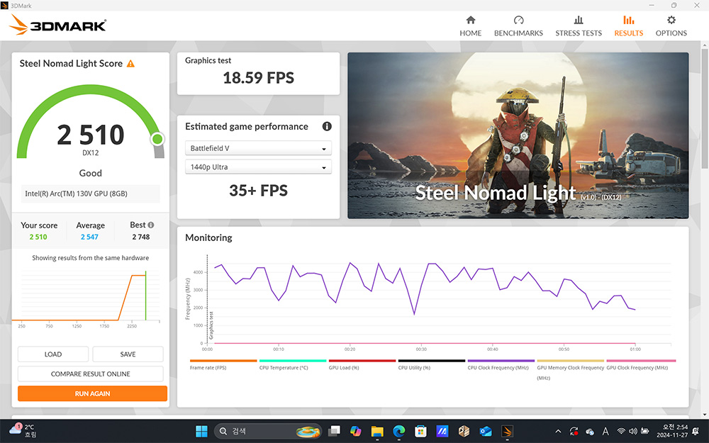내장그래픽은 인텔® Arc™ 130V가 사용되었는데요. 3DMARK Steel Nomad Light Score는 2510점 정도가 나옵니다. 새로운 Xe² 아키텍처로 이전 세대보다 게임 및 그래픽 성능을 1.5배 더 향상 시켰습니다. 물론 내장그래픽카드로 모든 게임이 원활하게 돌아간다고 말하긴 무리가 있지만 이제는 더 적은 전력으로 더 괜찮은 그래픽 성능을 낼 수 있게 했습니다.