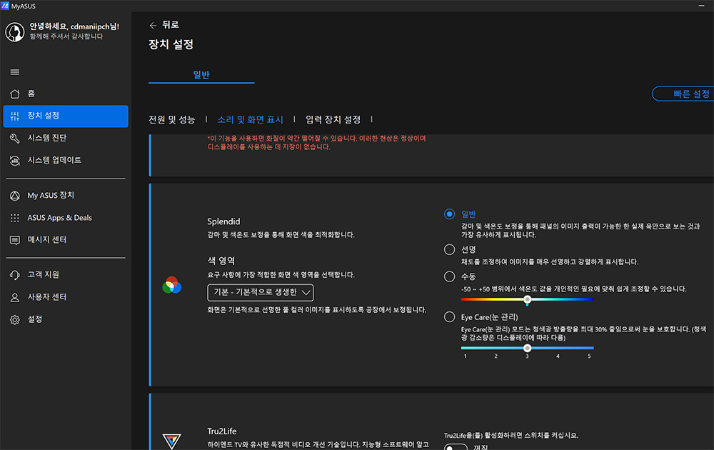 Splendid를 통해서 눈 관리 모드나 또는 선명 모드 그 외에 수동으로 자신이 원하는대로 컬러를 변경할 수 도 있습니다.